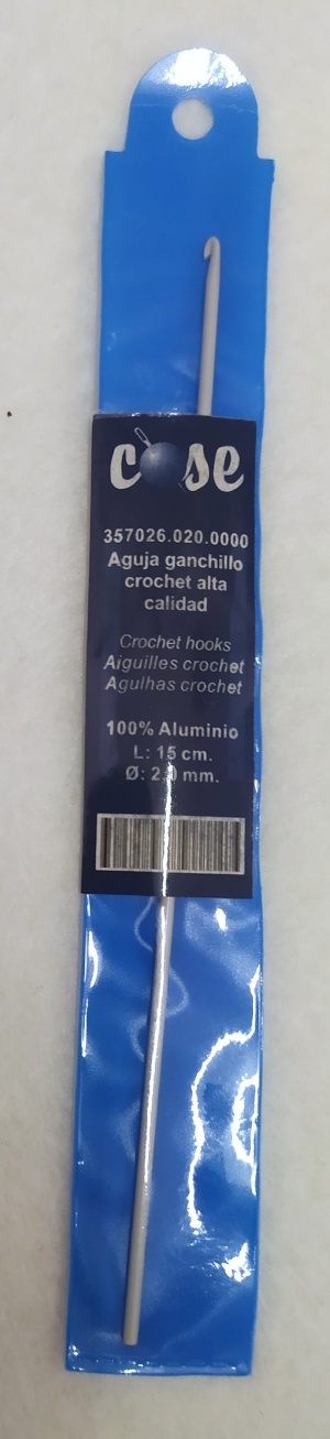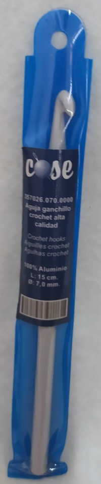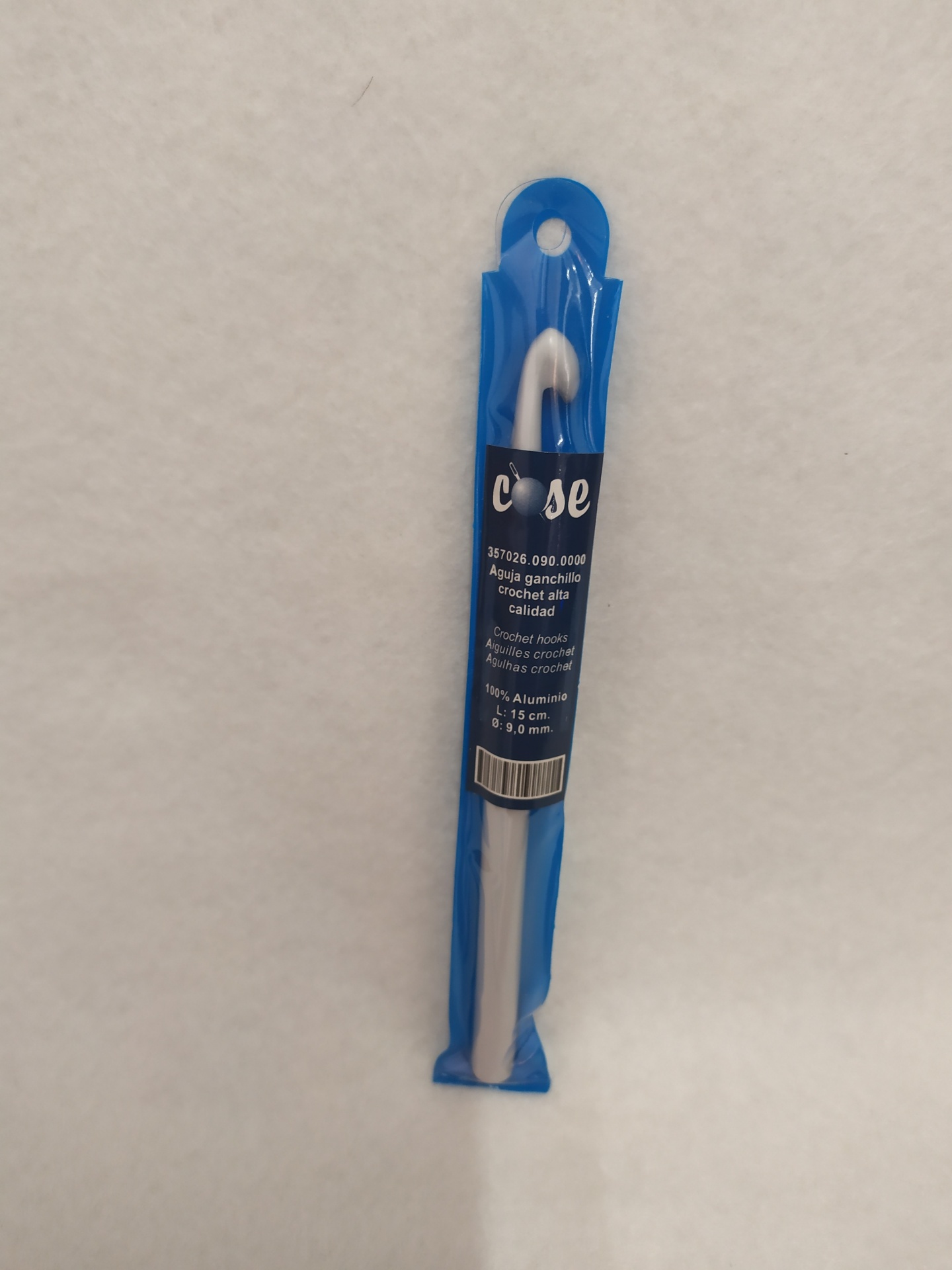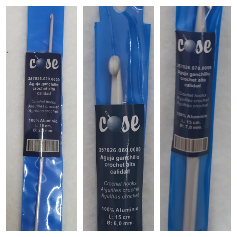 Conjunto de três agulhas de croché de alumínio com diferentes diâmetros em embalagens azuis da marca COSE