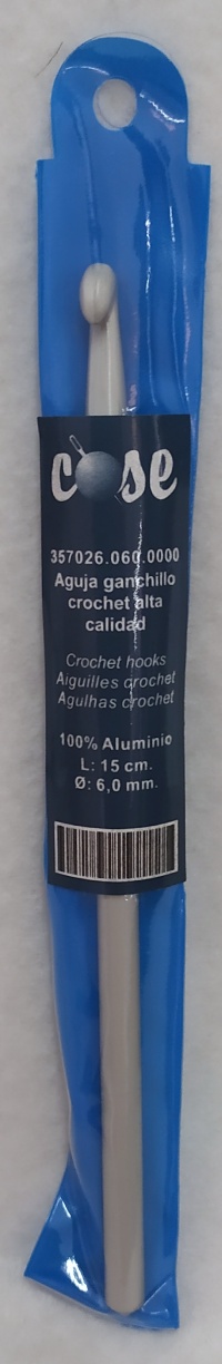 Agulha de croché em alumínio na embalagem azul com etiqueta preta