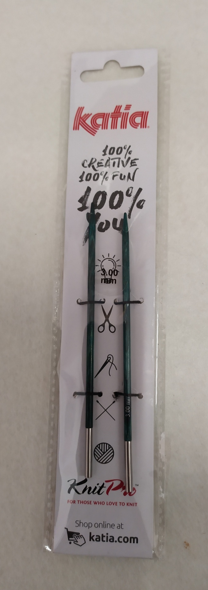Agulhas de tricô Katia verdes embaladas em cartão branco com texto impresso