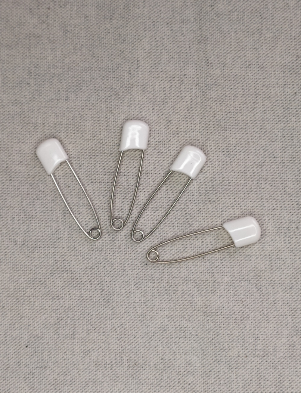 Alfinetes de segurança com cabeça branca sobre tecido cinzento