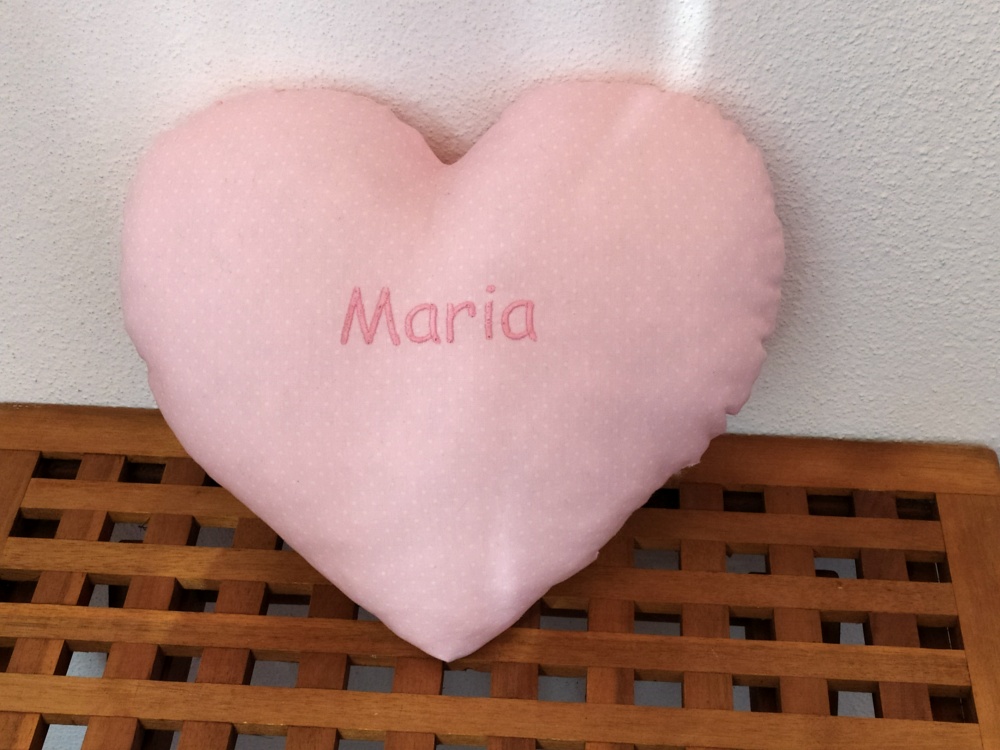 Almofada coração cor-de-rosa com a palavra Maria bordada