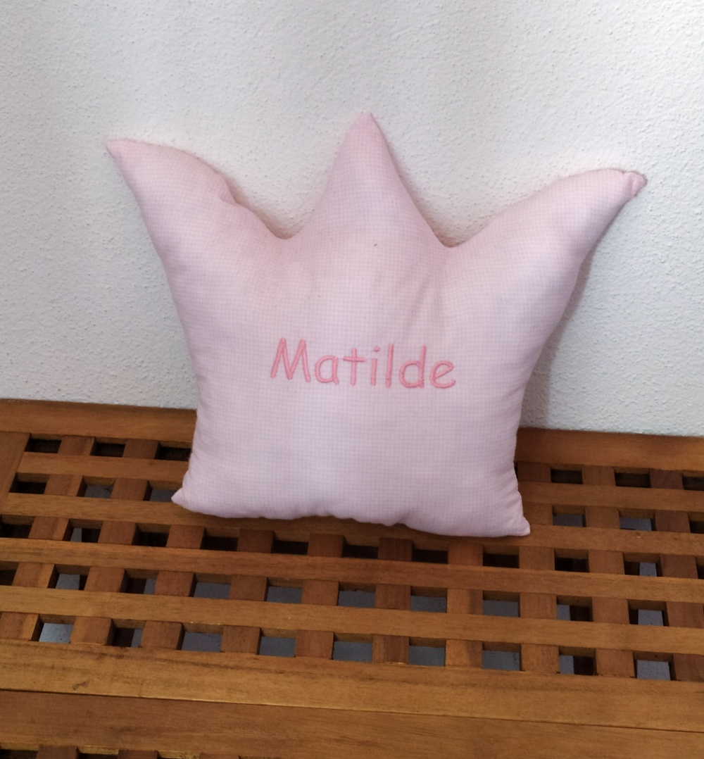 Almofada em forma de coroa rosa claro com o nome Matilde