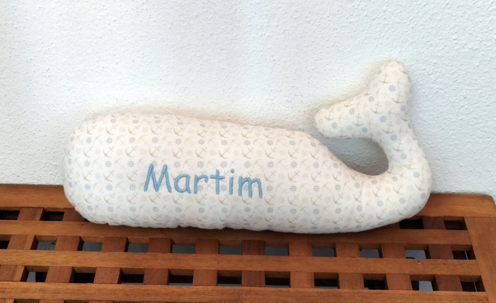 Pelúcia em forma de baleia branca com padrão floral e nome Martim