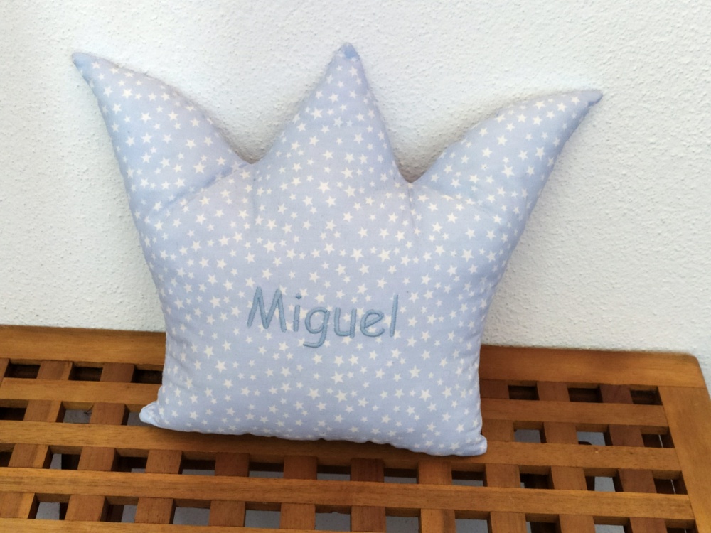 Almofada coroa azul claro com estrelas brancas e nome Miquel bordado