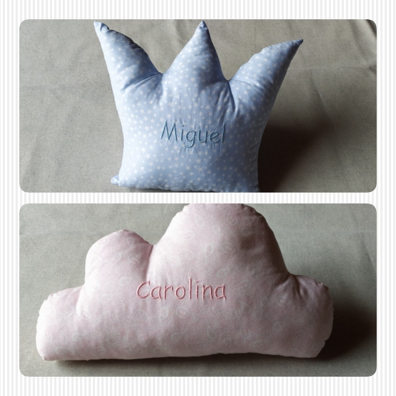 Duas almofadas, uma azul forma coroa com estrela e nome Miguel, outra rosa forma nuvem com nome Carolina
