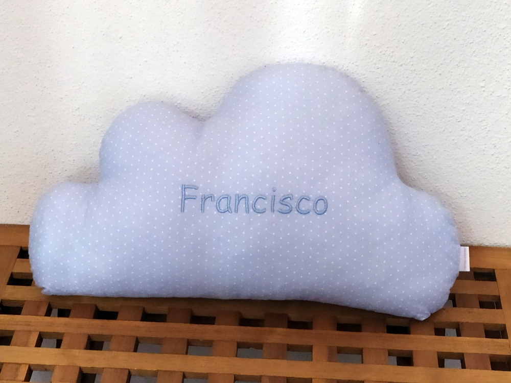 Almofada azul claro em forma de nuvem com nome Francisco bordado