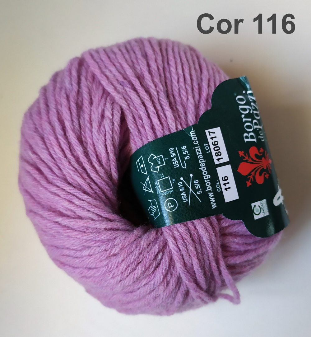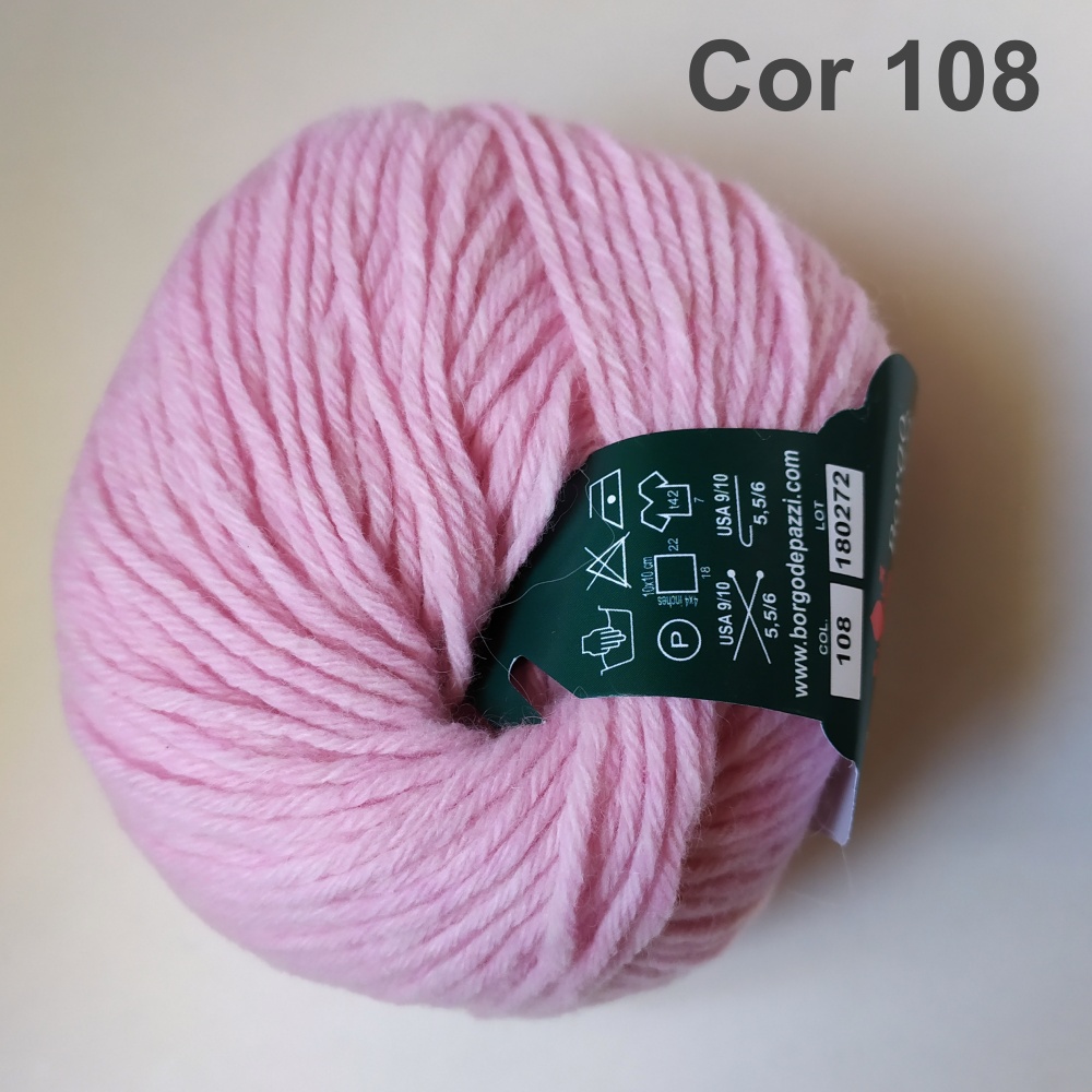 Novelo de lã cor-de-rosa claro com etiqueta preta e texto Cor 108