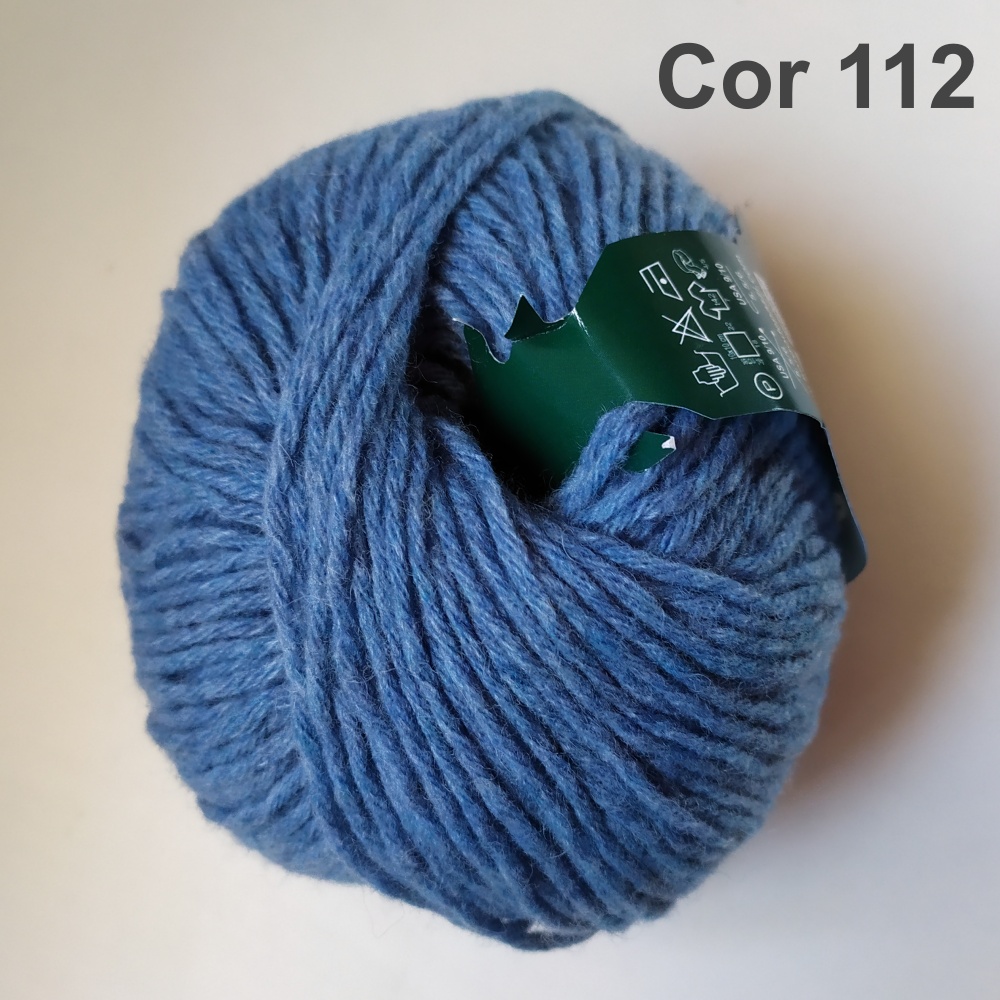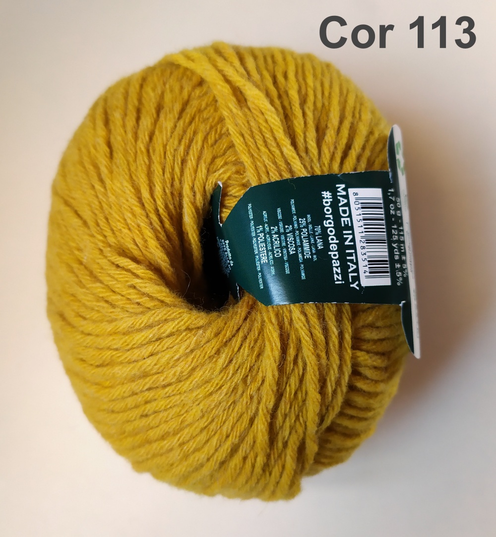 Novelo de lã amarelo-ocre com etiqueta verde escura, em superfície clara com texto Cor 113.