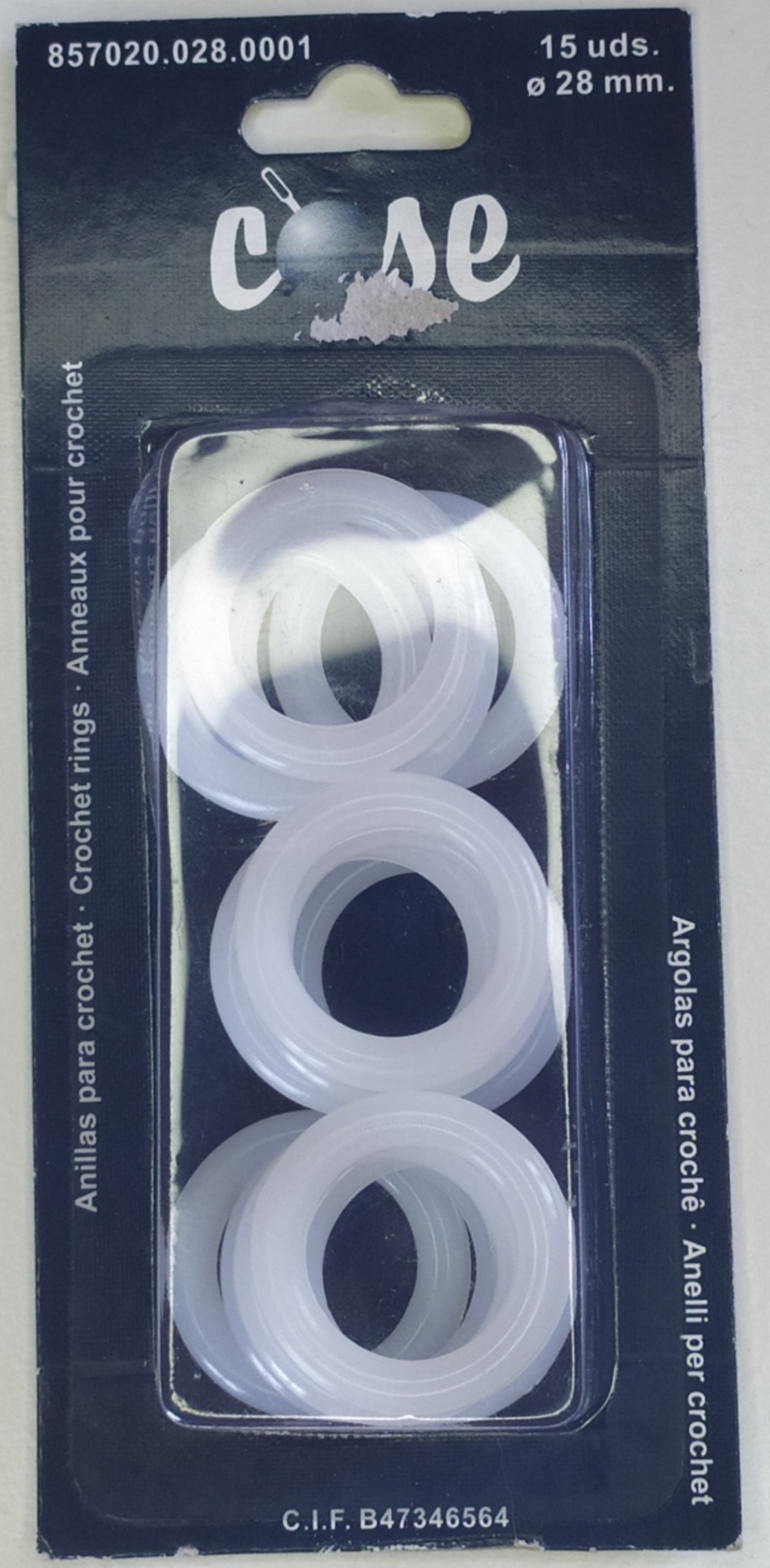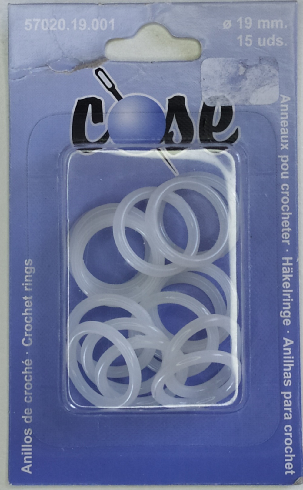 Embala de anéis para croché brancos em plástico translúcido, 15 unidades, 19 mm, marca COSE