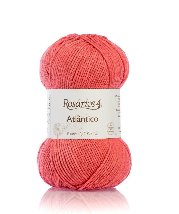 Novelo de lã cor coral Rosários 4 Atlântico com etiqueta branca