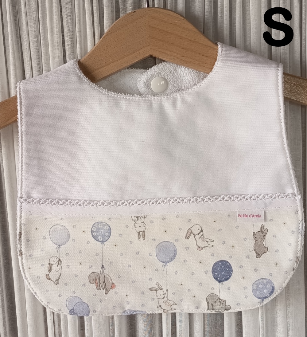 Babete branco para bebé com estampado de coelhos e balões em azul e cinzento.