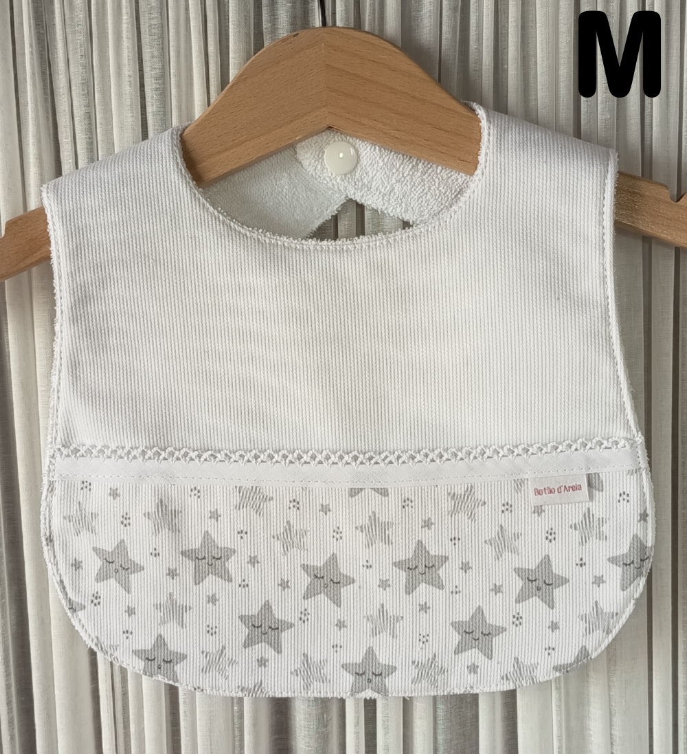 Babete de bebé branco com estrelas cinzentas pendurado num cabide de madeira