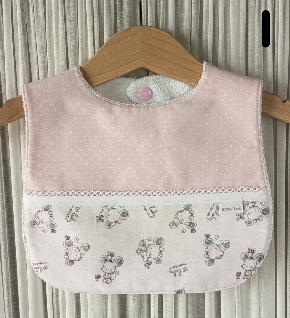 Babete de criança rosa e branco com estampado de ratos e botão de pressão