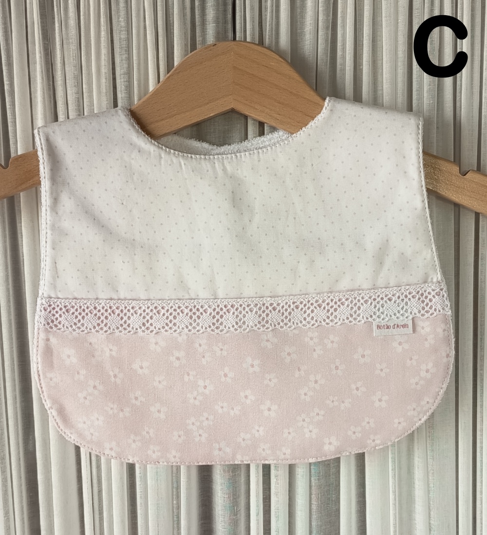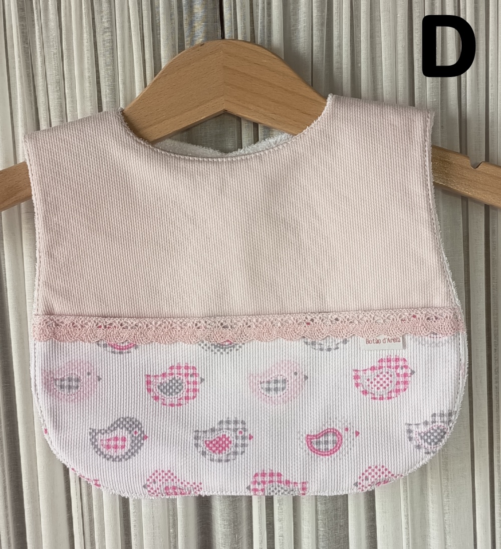 Babete para bebé rosa claro com padrão de passarinhos e renda rosa