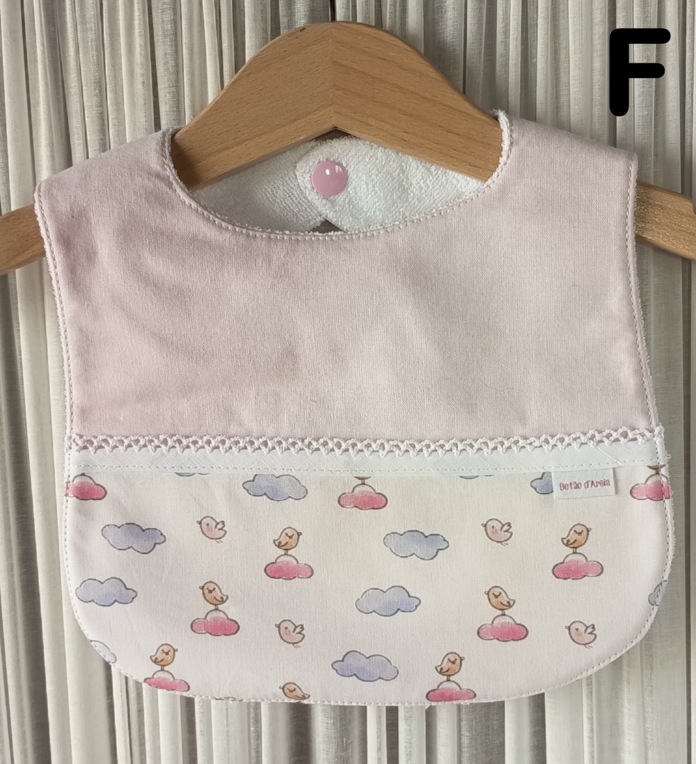 Babete rosa claro com padrão de nuvens e pássaros