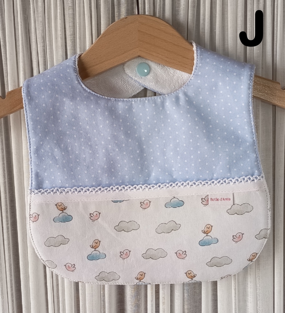 Babete azul claro com bolinhas brancas e parte inferior estampada com nuvens e passarinhos