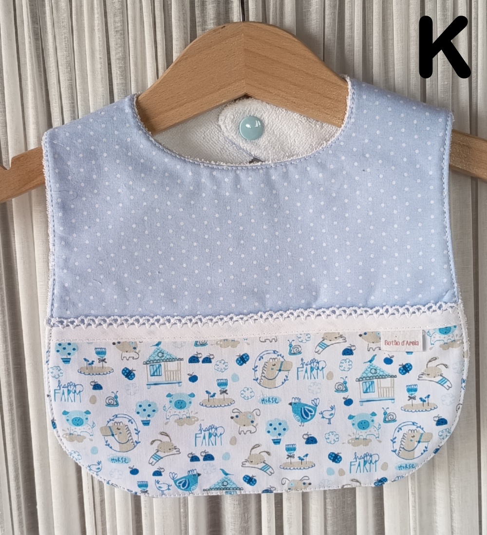 Babete para bebé azul com bolinhas brancas e padrão infantil colorido.