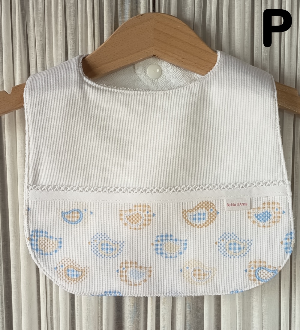 Babete branco com padrão de pássaros azuis e castanhos