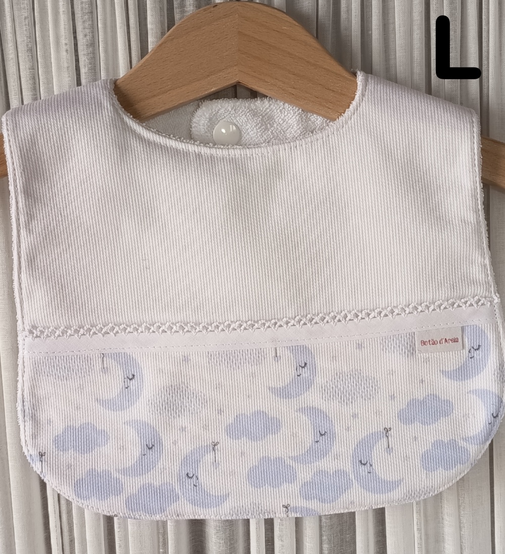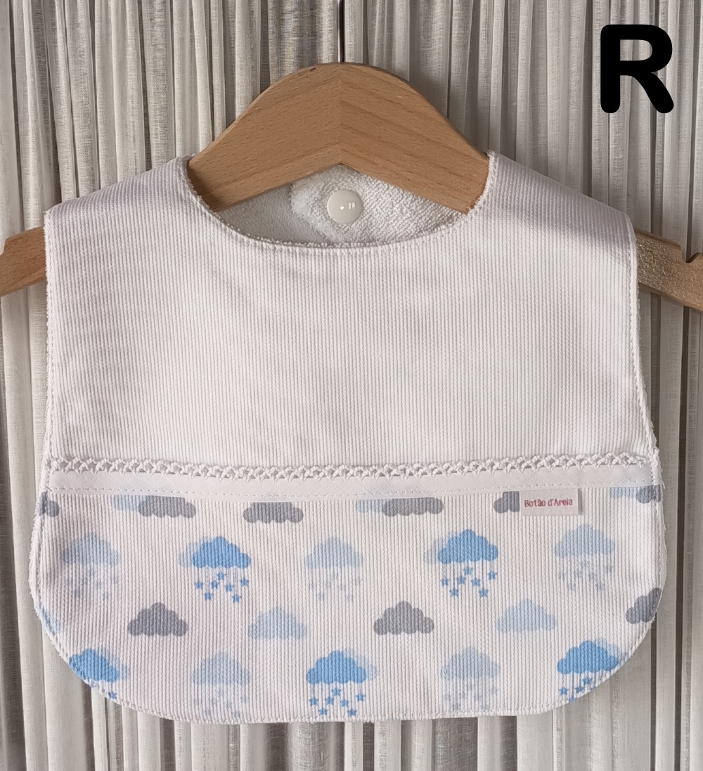 Babete branco com padrão de nuvens azuis e cinzentas