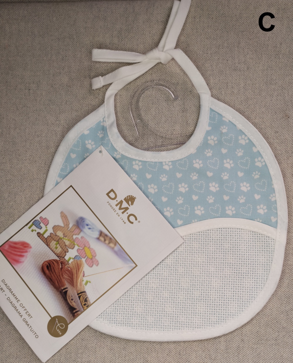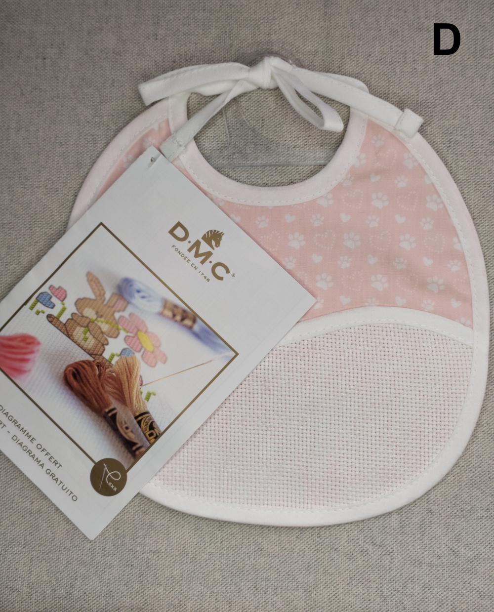 Babete de bebé rosa com padrão de patas brancas e pacote DMC para bordado