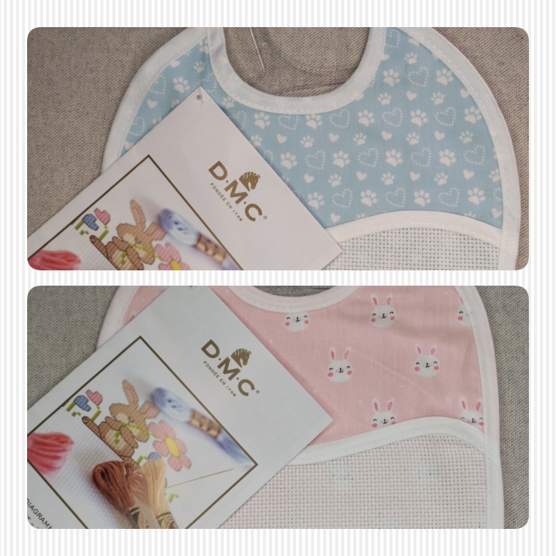 Dois babetes para bebé azul claro e rosa claro com padrões e embalagem DMC