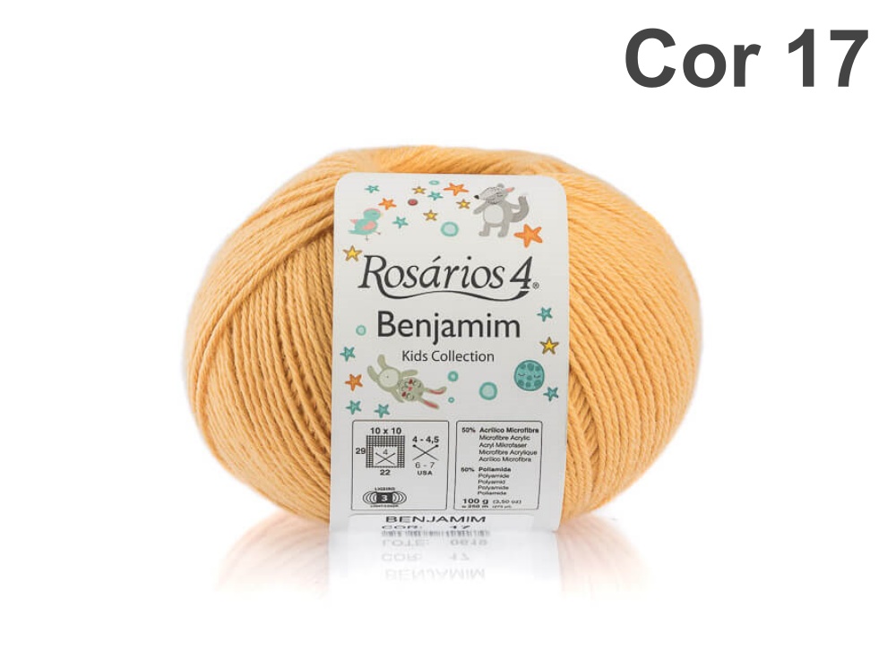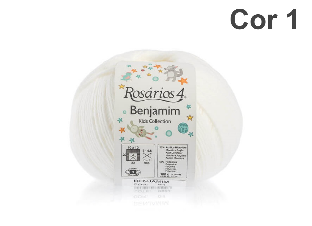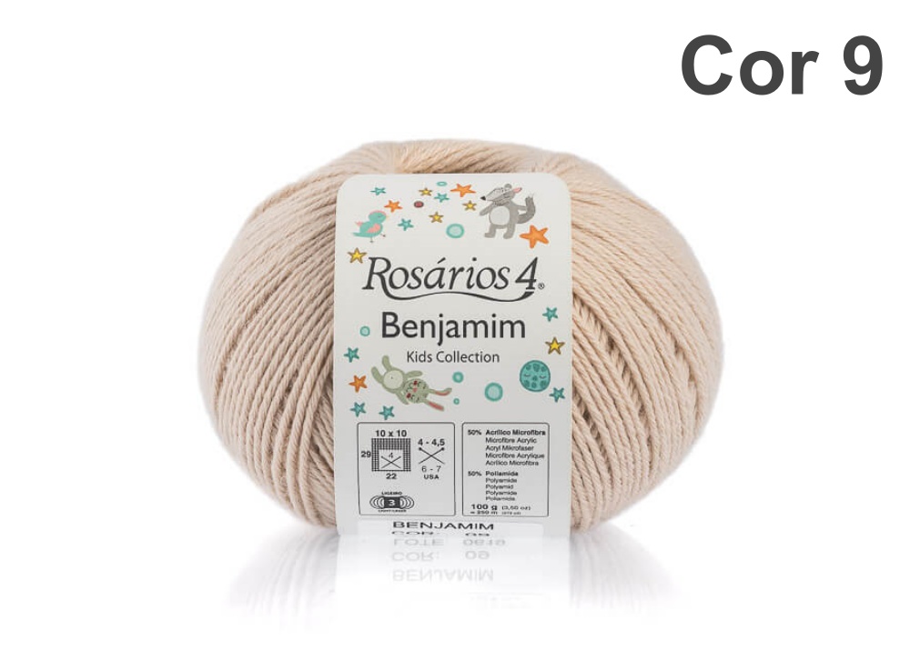 Novelo de lã bege Rosários 4 Benjamim com rótulo branco e texto