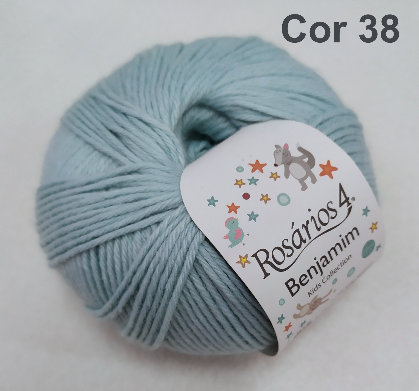 Novelo de lã azul claro com etiqueta Rosários 4 Benjamim Cor 38