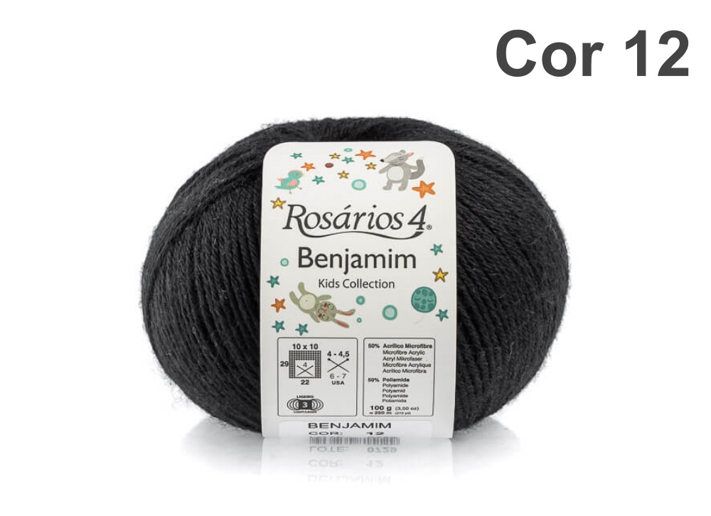 Novelo de lã preta Rosários4 Benjamim Cor 12 com etiqueta em fundo branco