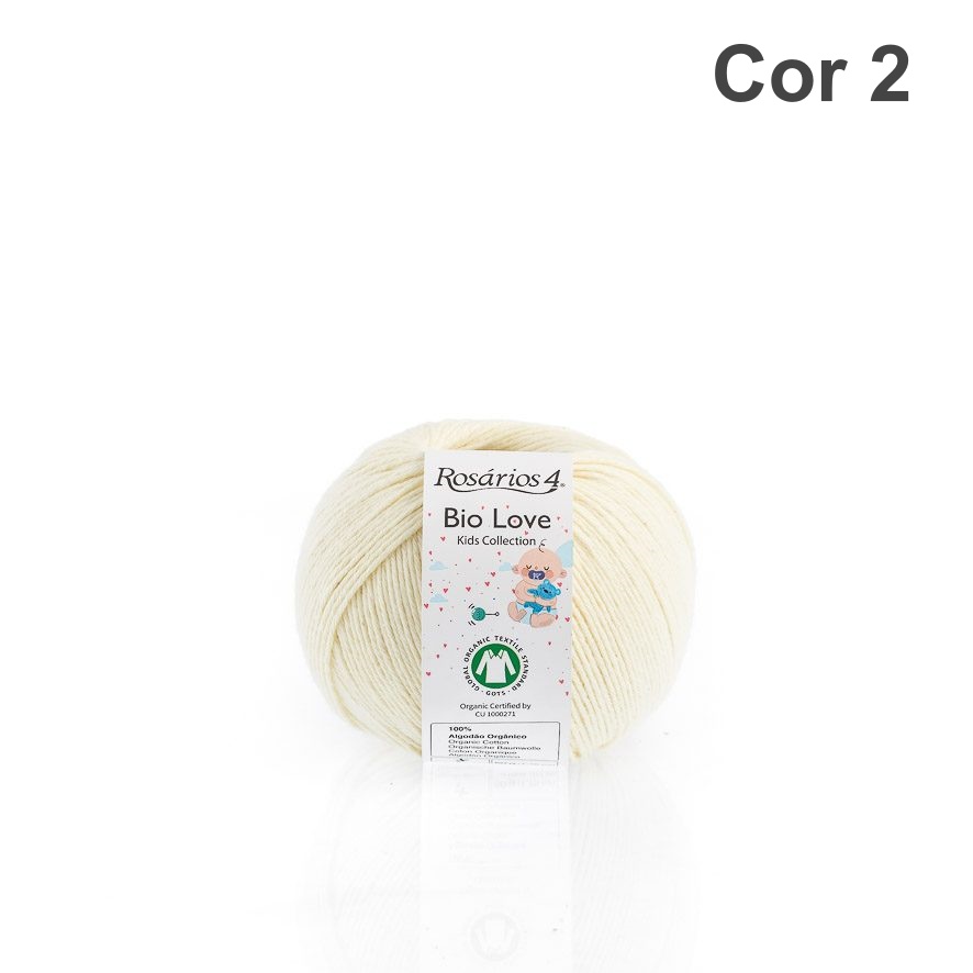 Novelo de fio de lã branca Rosários 4 Bio Love com etiqueta e texto Cor 2