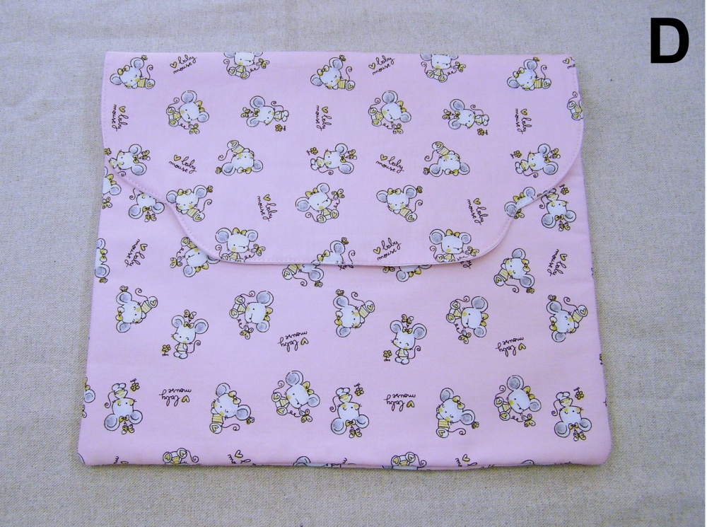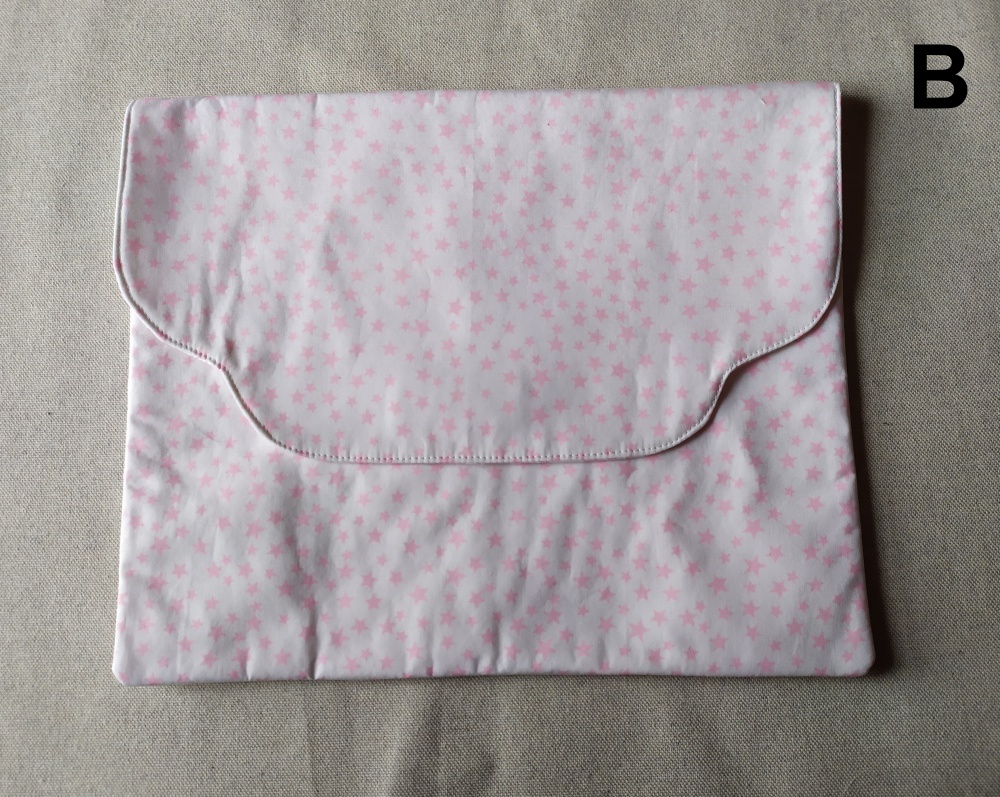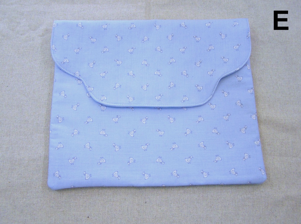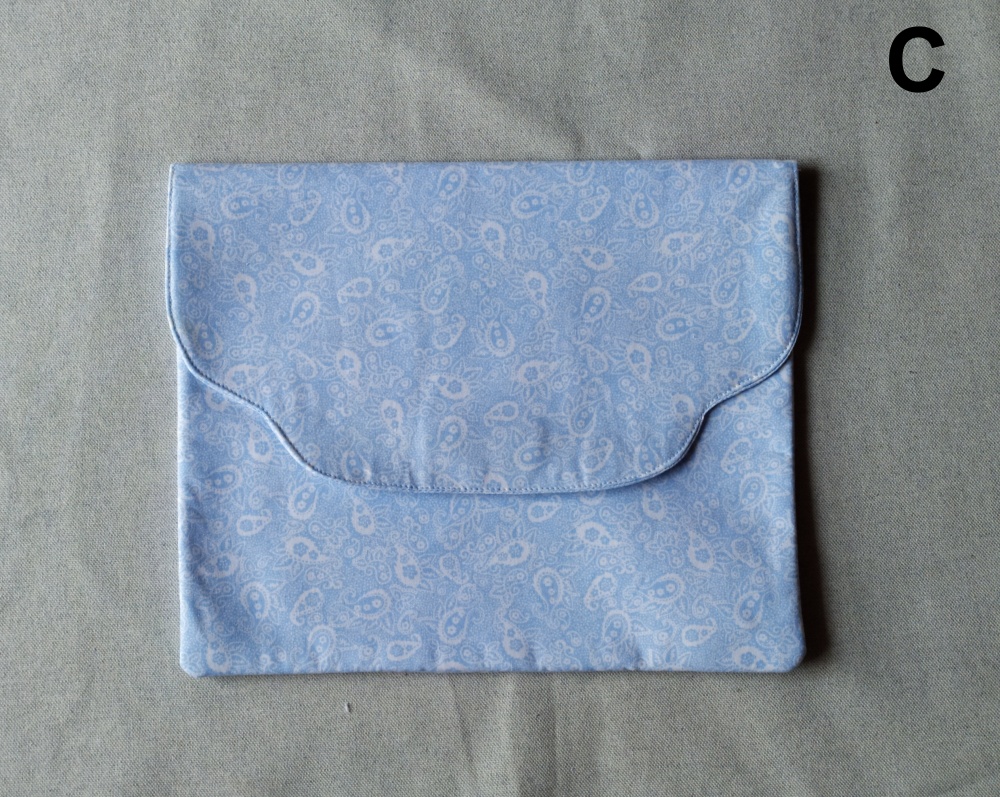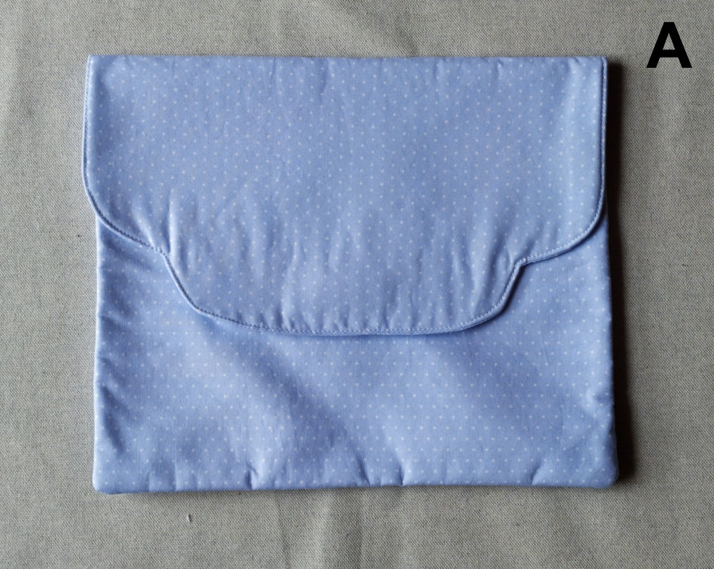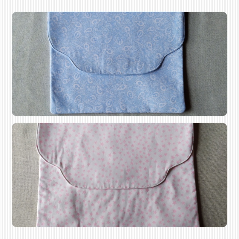 Envelope de tecido azul claro com pequenos desenhos brancos e rosas e botão de pressão