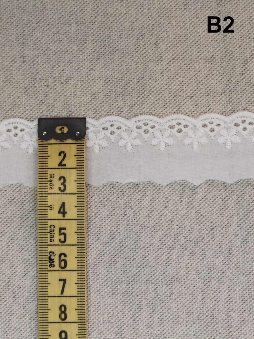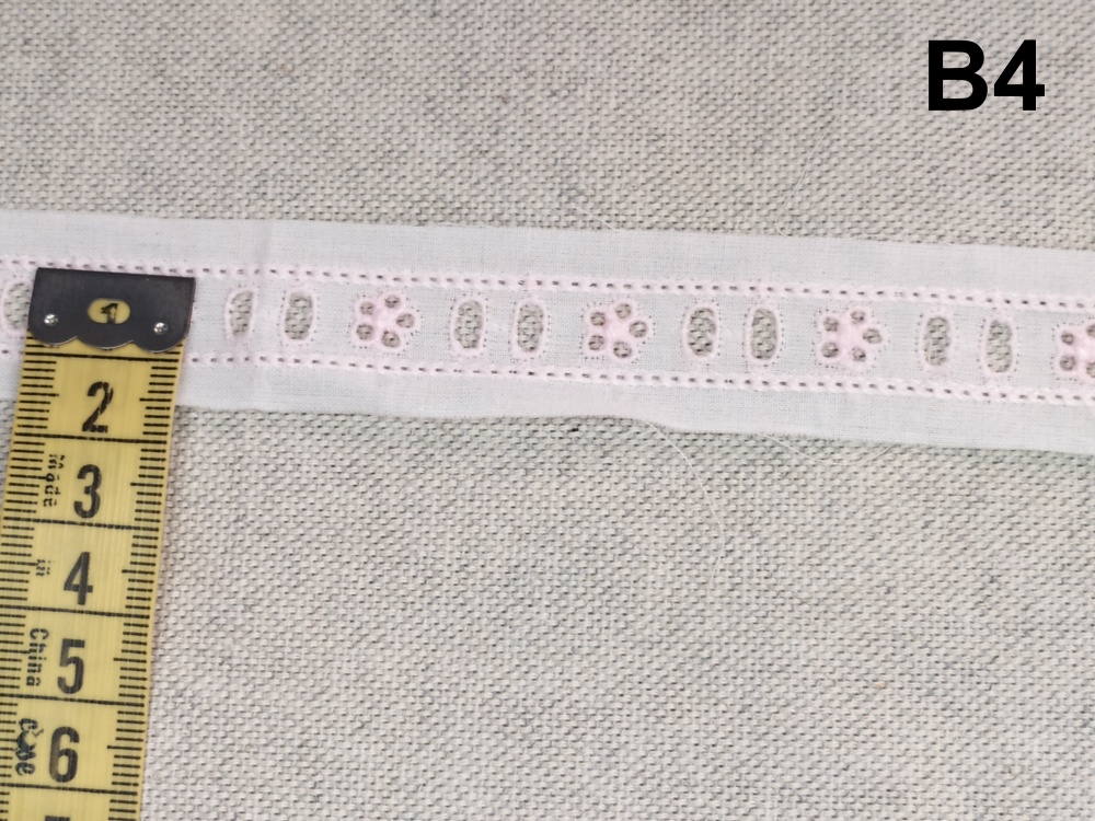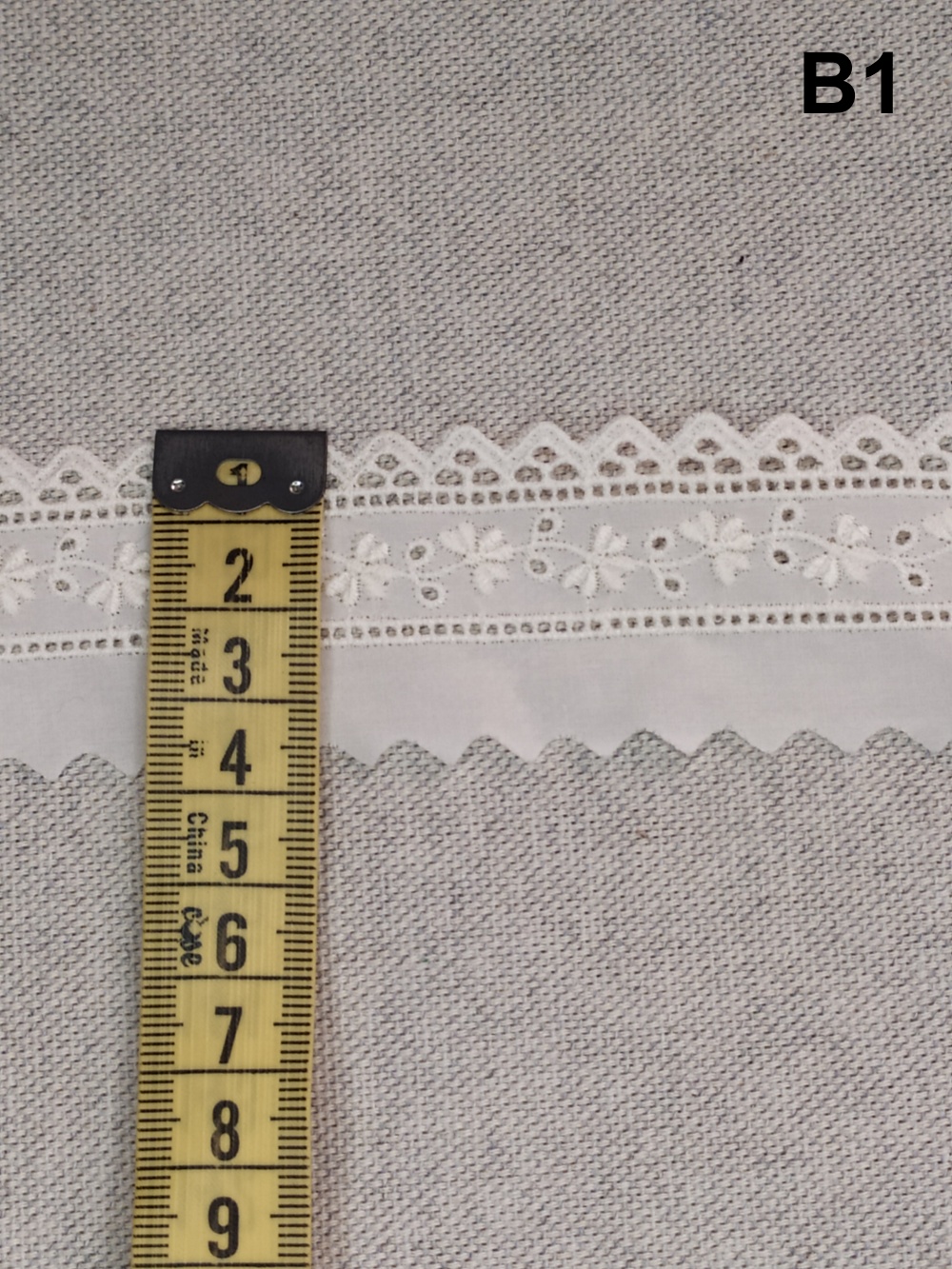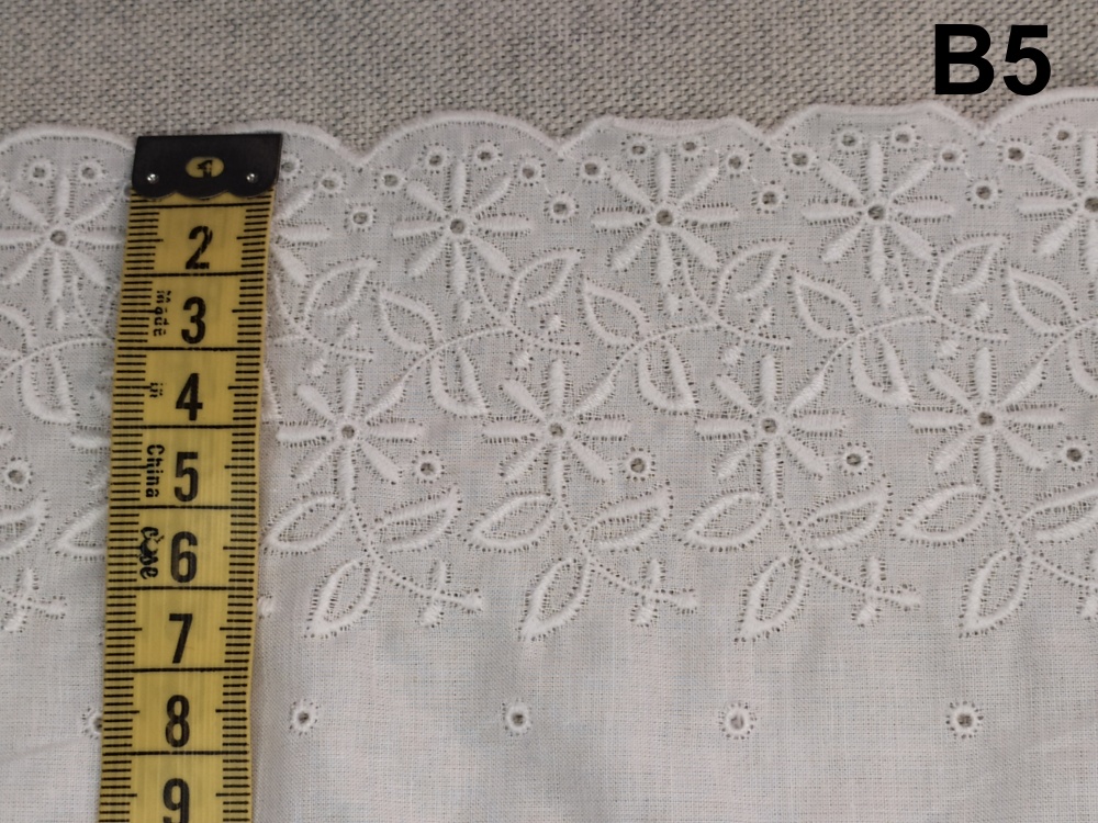 Tecido branco com bordado floral medido por fita métrica amarela, texto B5