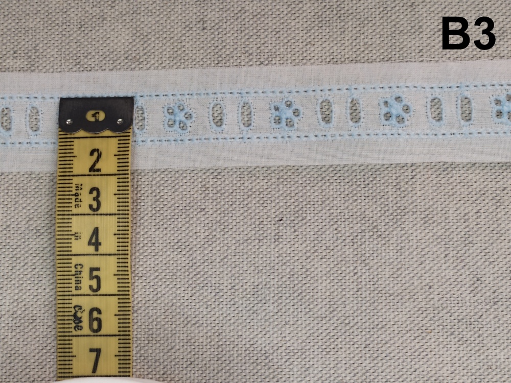 Fita têxtil branca com padrão azul e bege com fita métrica amarela ao lado e texto B3