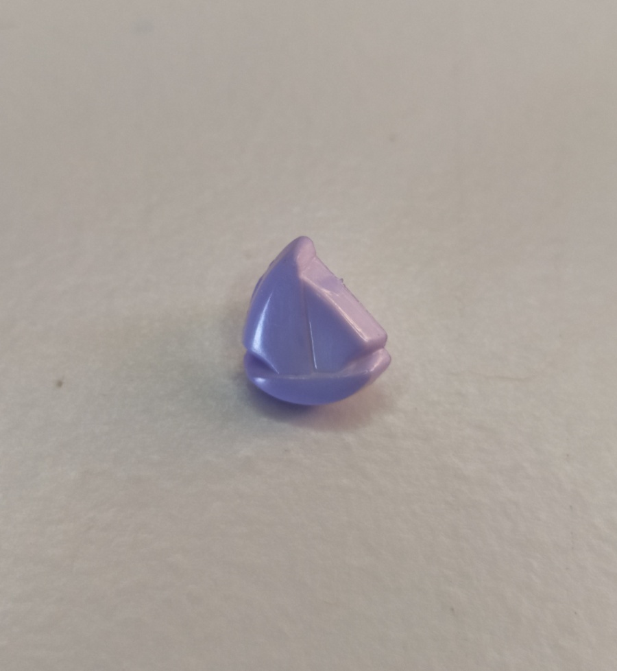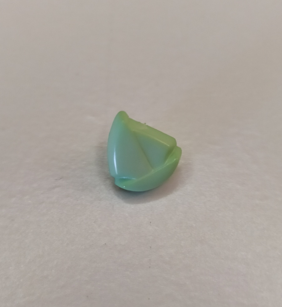 Peça pequena de plástico verde claro de forma triangular sobre superfície branca