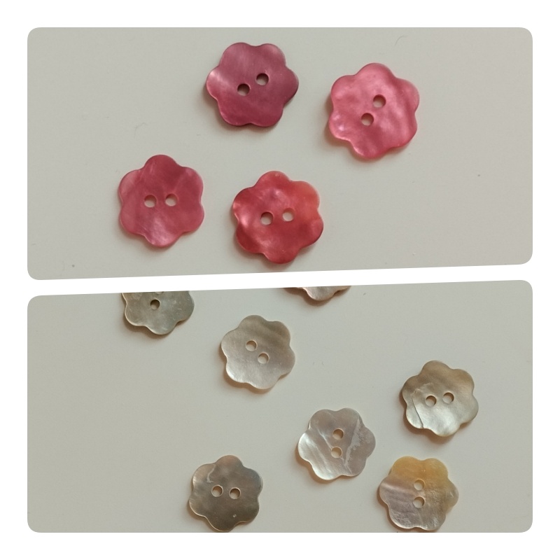 Botões florais em rosa e tons neutros com dois furos, sobre fundo branco.