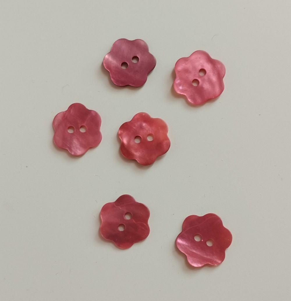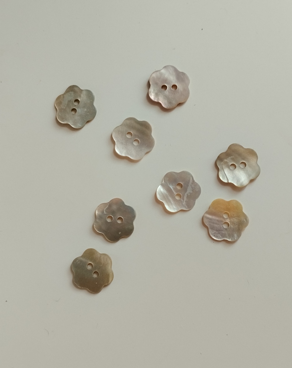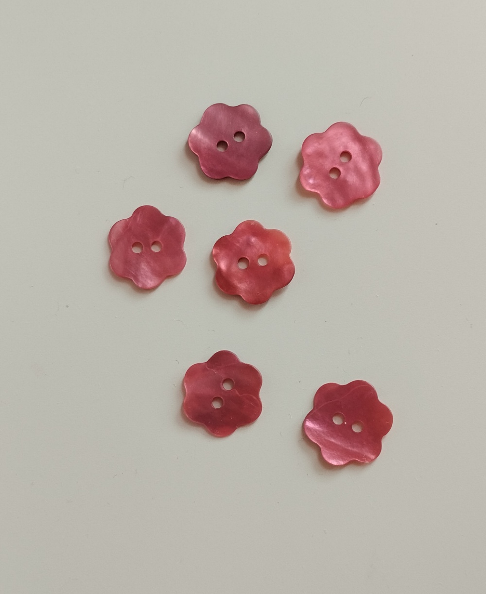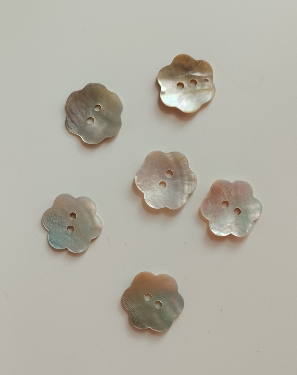 Seis botões pequenos em forma de flor de madrepérola com dois furos em fundo branco