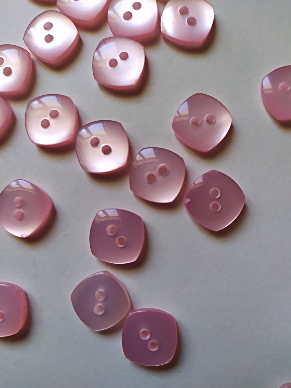 Botões quadrados rosados translúcidos com dois furos sobre fundo branco