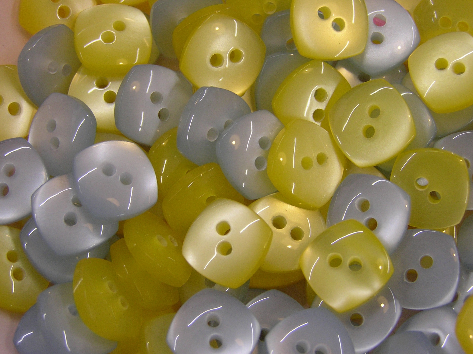 Botões quadrados amarelos, cinzentos e bege com dois orifícios