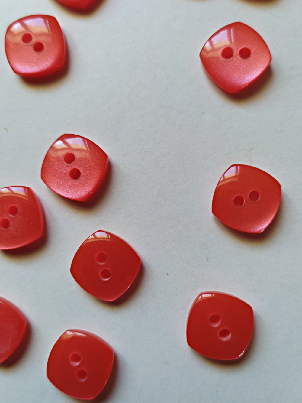 Botões quadrados vermelhos com dois furos sobre superfície branca