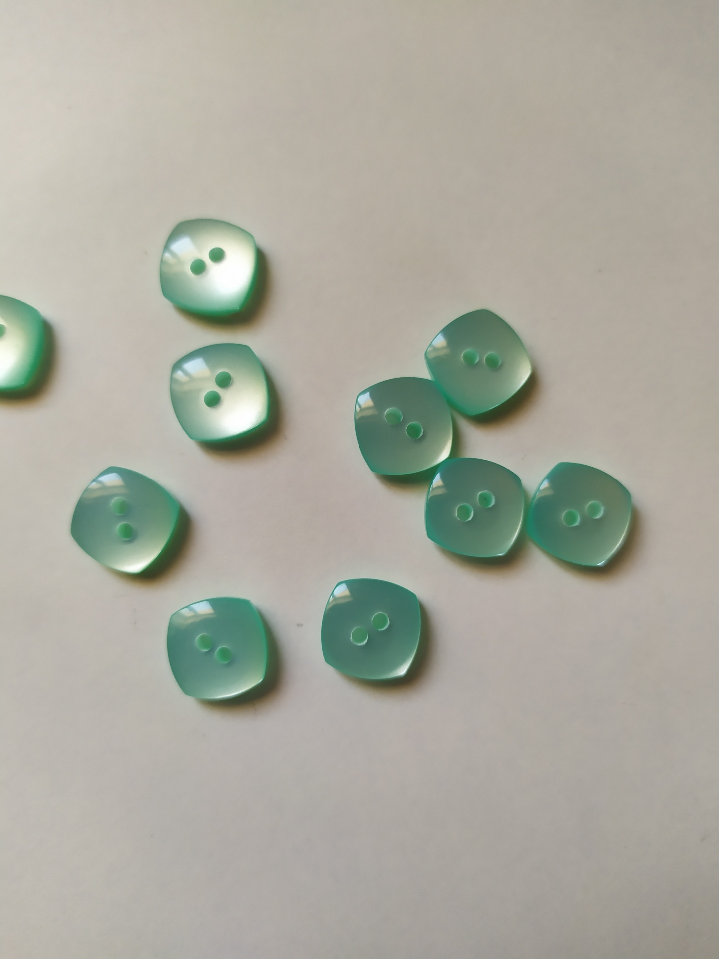 Botões quadrados verde água com dois furos sobre fundo branco
