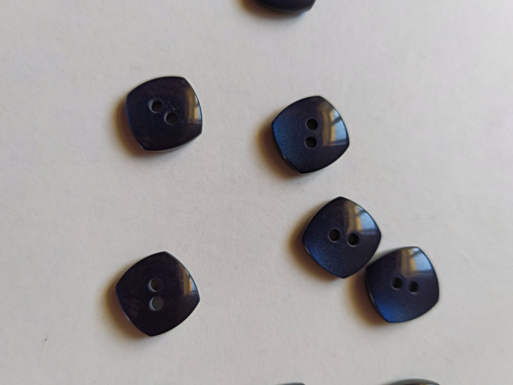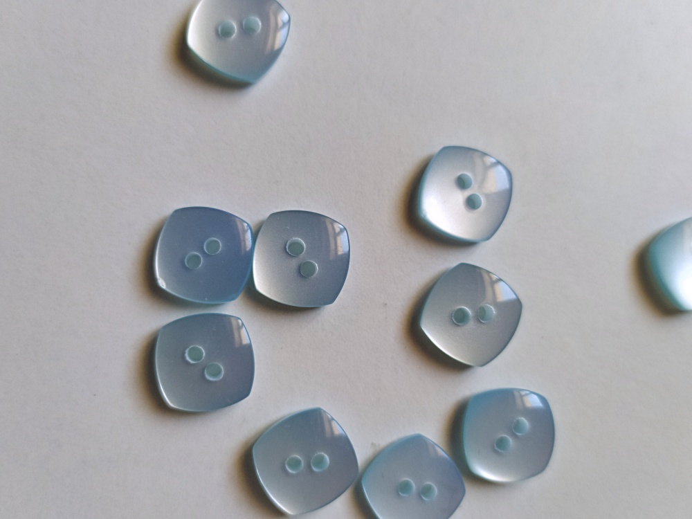 Botões quadrados azuis translúcidos com dois furos em fundo branco