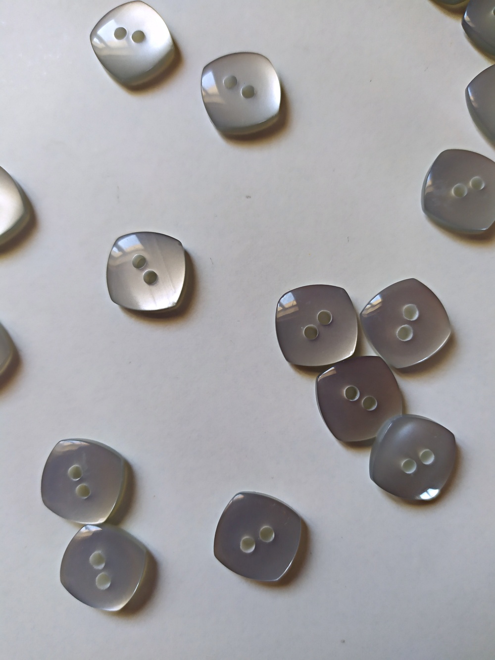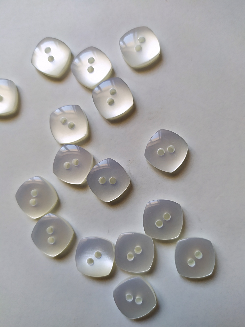 Botões quadrados translúcidos com dois furos em superfície branca