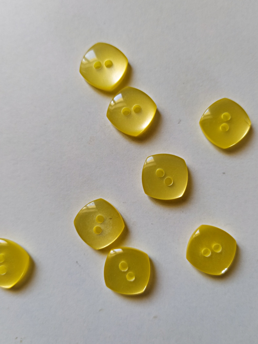 Botões quadrados amarelos translúcidos com dois orifícios, em fundo branco