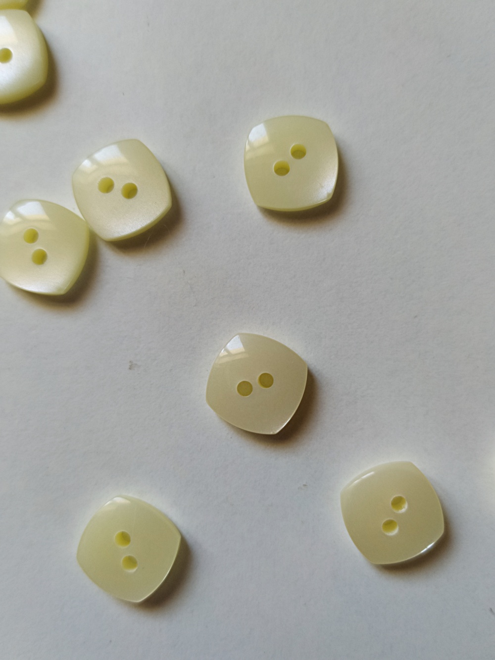 Botões quadrados amarelo claro com dois buracos, sobre fundo branco