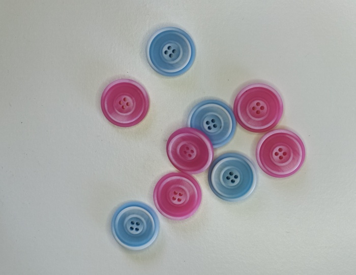 Botões de plástico azuis e cor-de-rosa sobre fundo branco