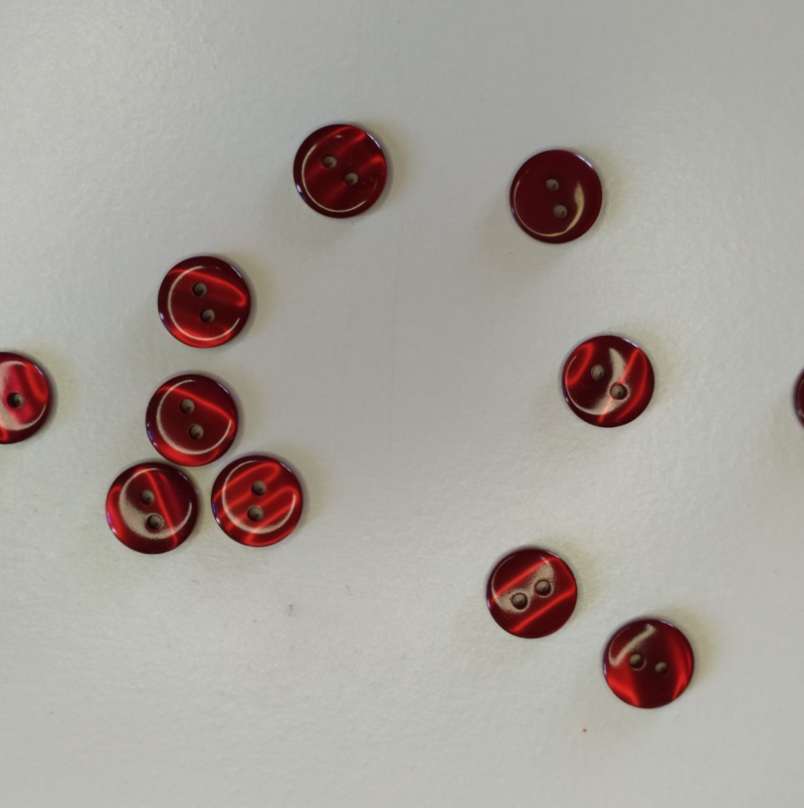 Botões redondos vermelhos translúcidos com dois orifícios em fundo branco