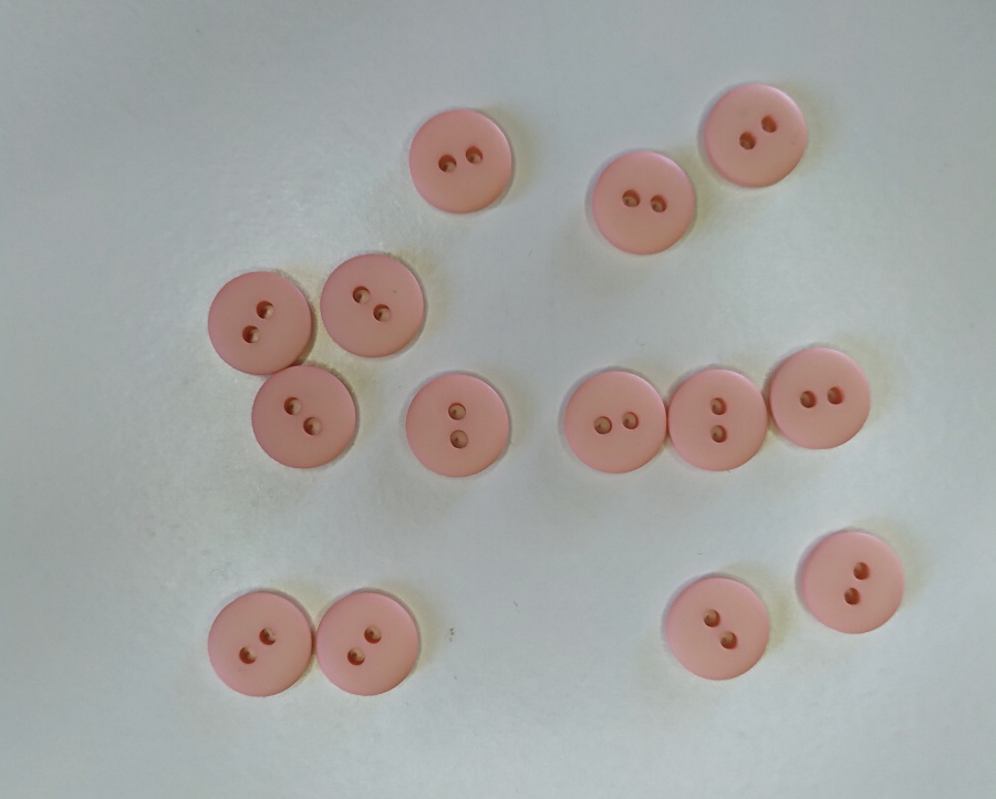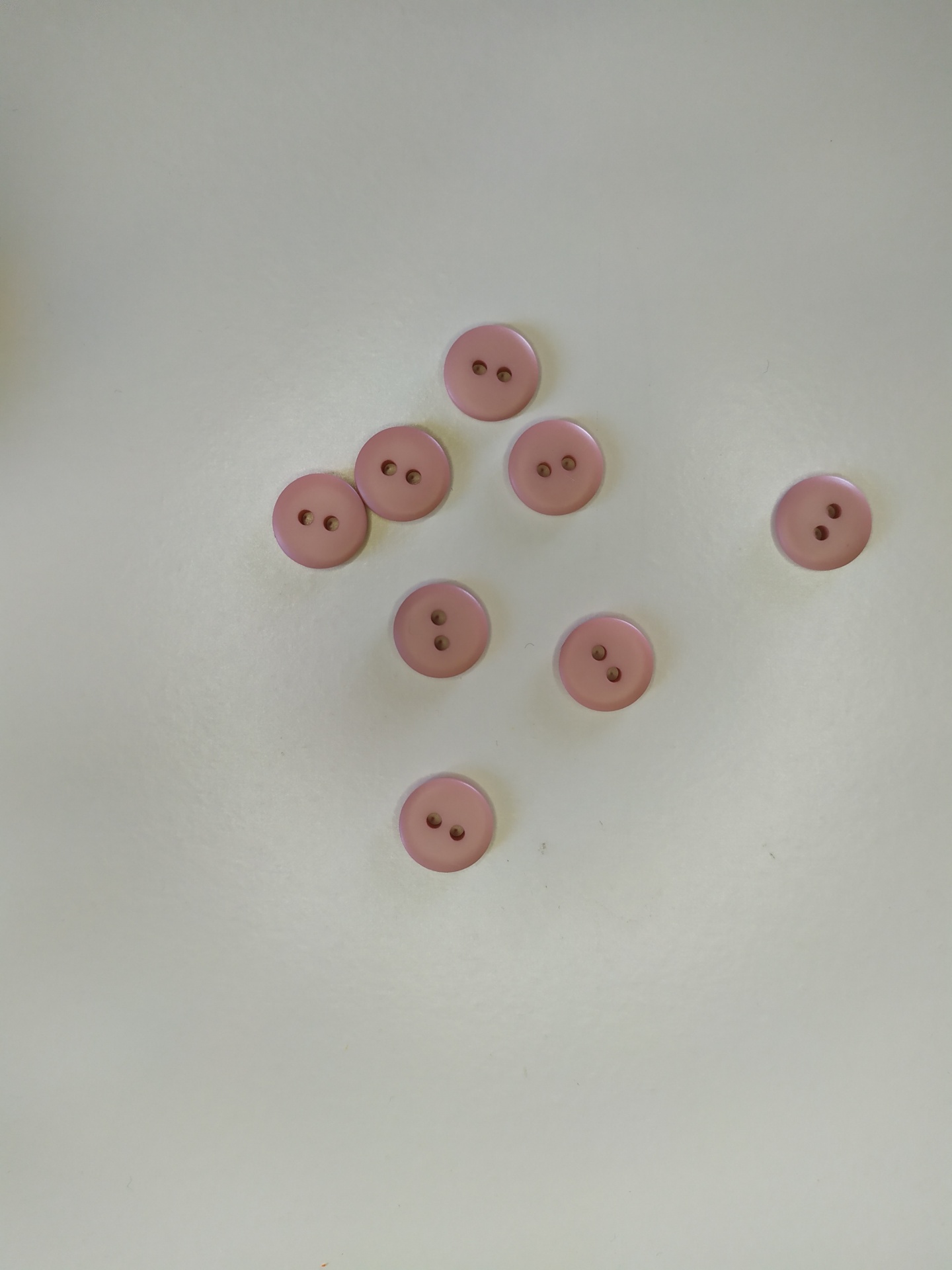 Oito botões rosa claros com dois furos, sobre fundo branco