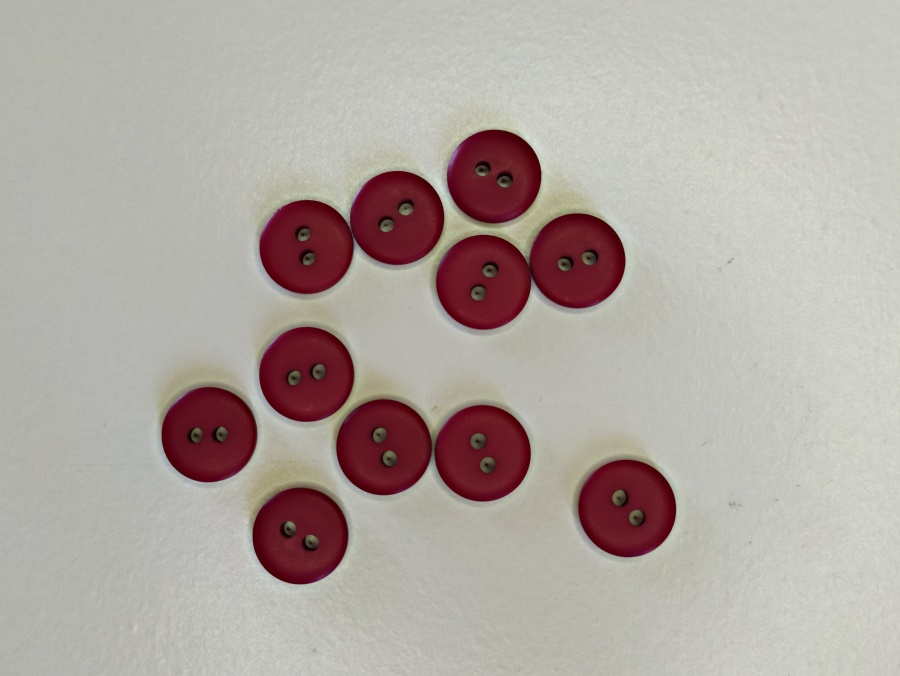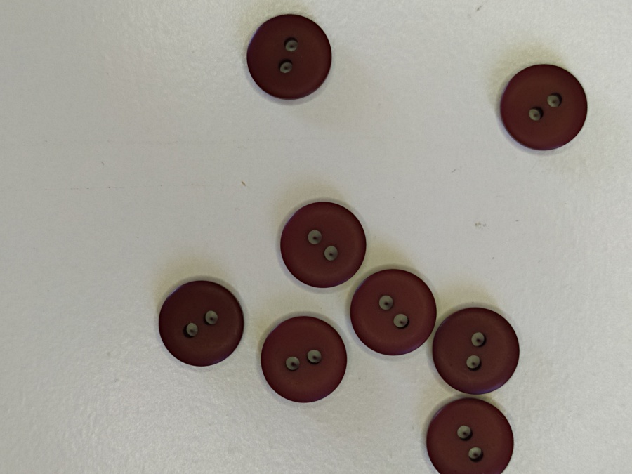 Dez botões redondos bordôs com dois orifícios sobre fundo branco