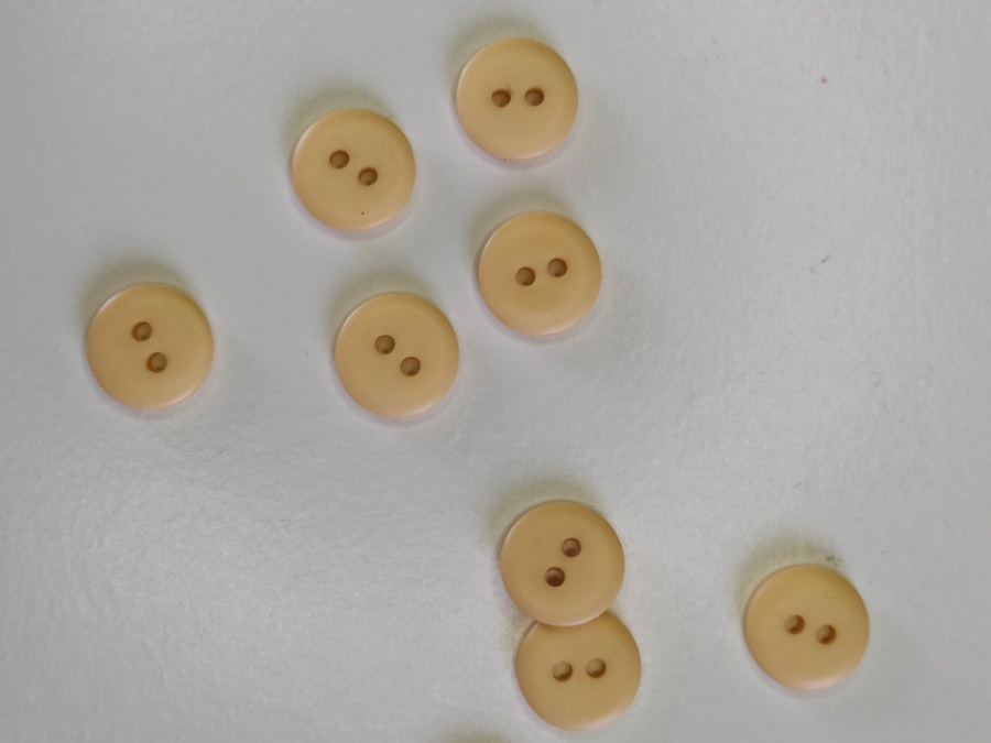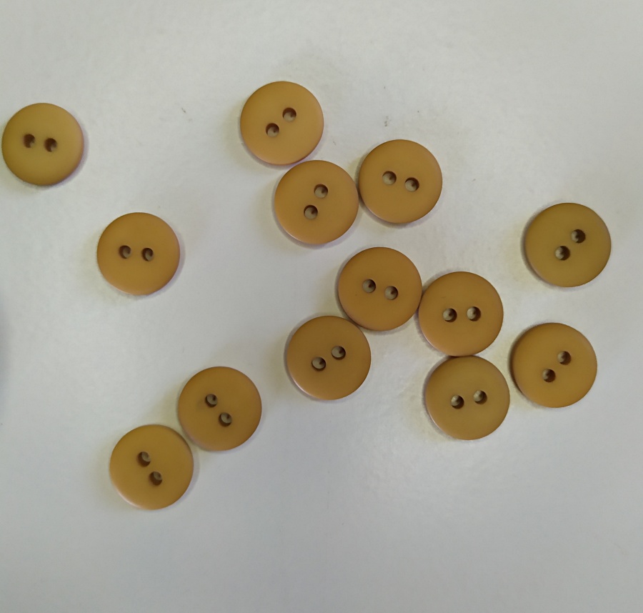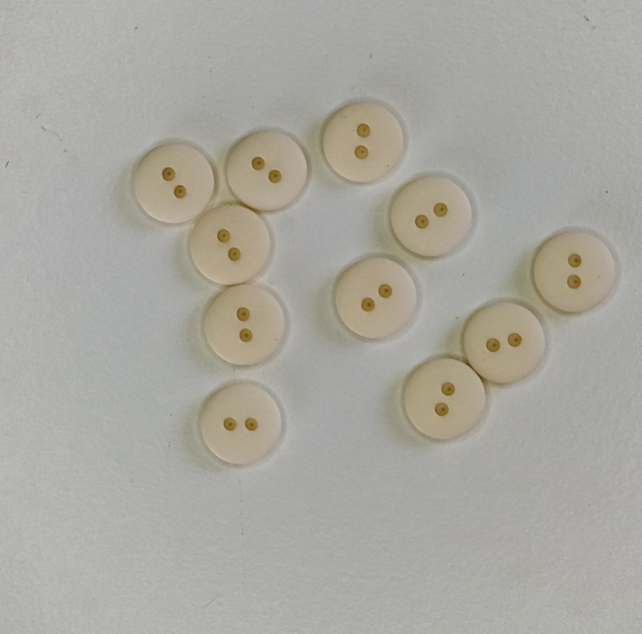 Botões castanhos claros circulares com dois orifícios, sobre superfície branca