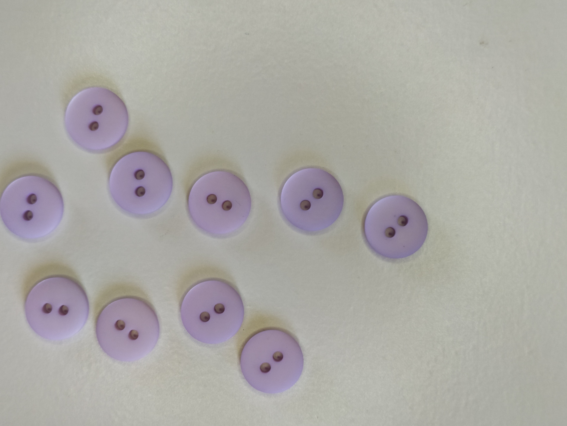 Botões lilás de plástico com dois furos sobre superfície branca
