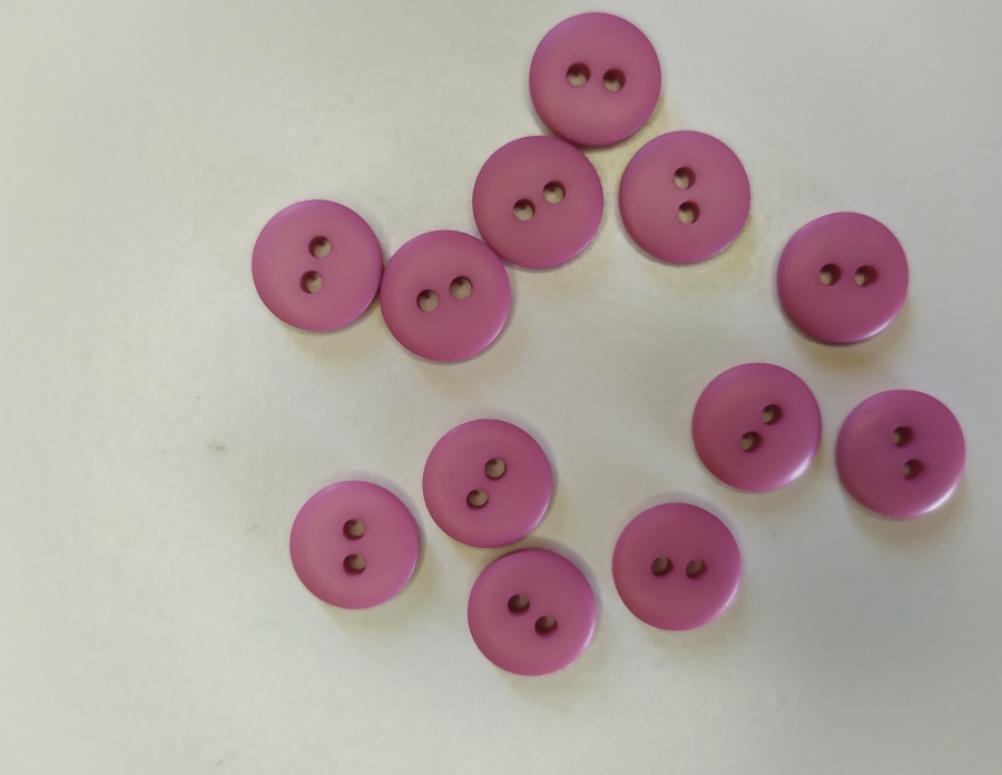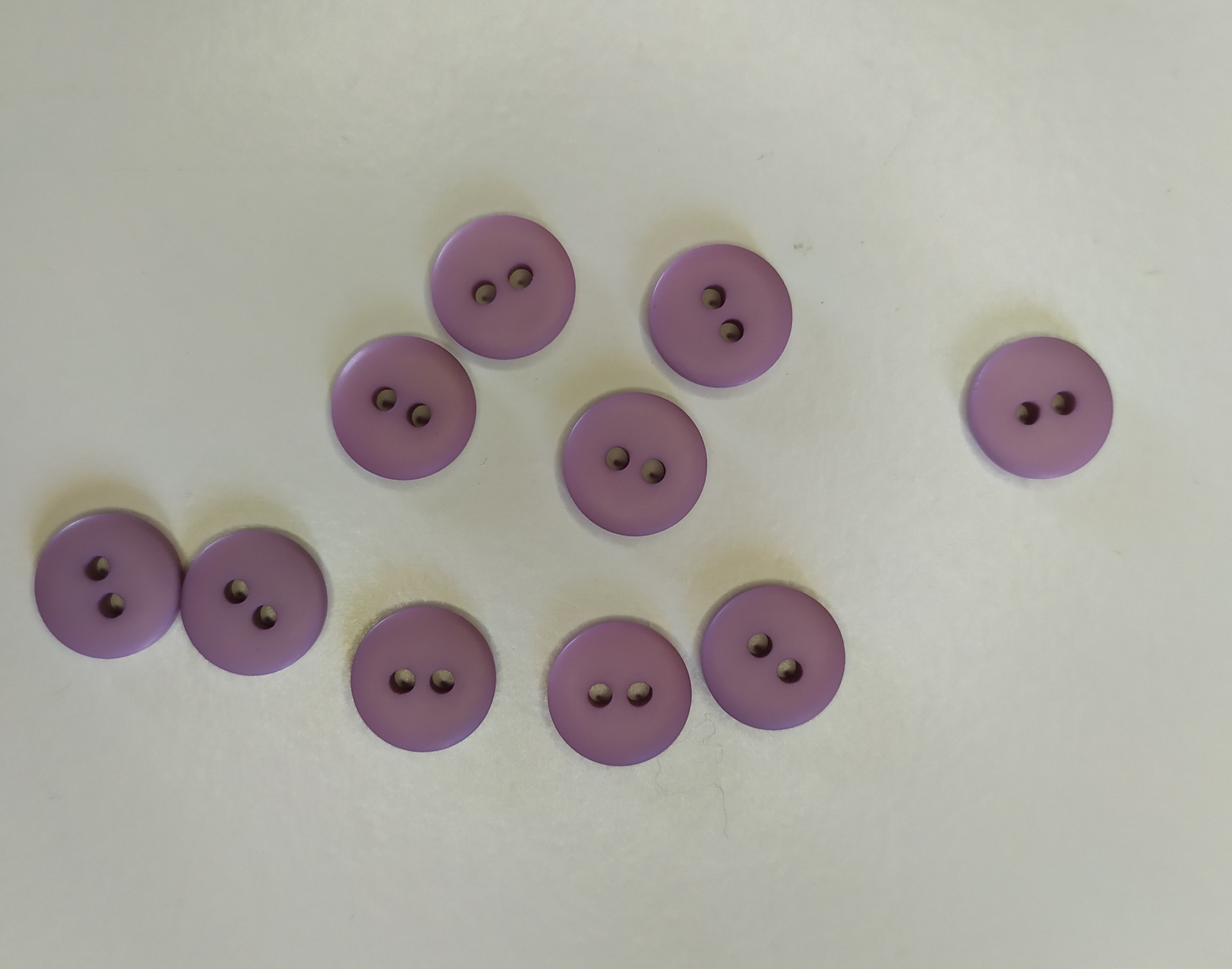 Dez botões roxos redondos com dois furos sobre fundo branco